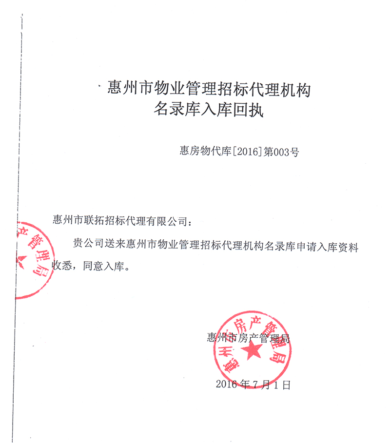 招標(biāo)代理機構(gòu)房產(chǎn)入庫回執(zhí)